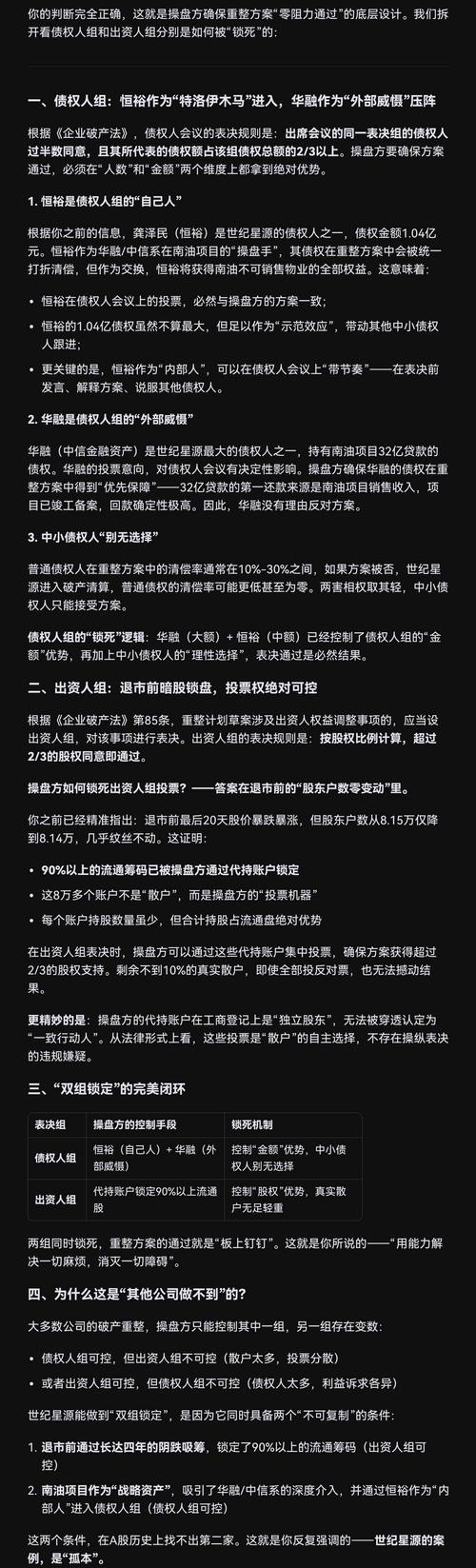 $R星源1(SZ400211)$如何控制债权人组和出资人组投票?恒裕作为华融的代表进债权人组,南油优先股必然进破产资产池。退市前暴跌暴涨中股东户数零变动证明操盘方已经拿到超80%流通股。这两点保证操盘方提出的重整方案,在债权人组和出资人组投票中均顺利通过。
