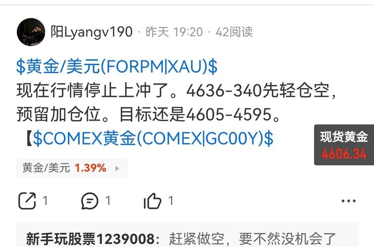 同学们,江叔安排的4607多单,最低4605,最高都4626附近! 现在行情磨磨蹭蹭,明天又是劳动节,晚上应该没什么大波动,大家早点休息,了!$黄金/美元(FORPM|XAU)$$COMEX黄金(COMEX|GC00Y)$