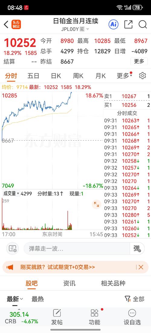 $日铂金当月连续(TOCOM|JPL00Y)$直接跌10个点,撑住的明天能出来了,就怕多空双杀
