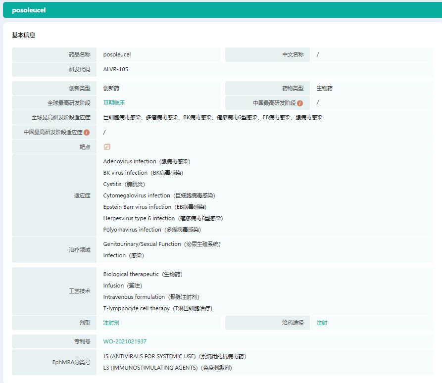 近日,吉利德及其他公司投资1.27亿美元支持AlloVir的多病毒特异性T细胞疗法posoleucel,为posoleucel三项正在进行的III期试验提供了资金。AlloVir周三表示,新资金还将支持该疗法的全球监管备案。posoleucel药物基本信息截图来源:药融云全球药物研发数据库该多病毒特异性T细胞疗法前身为Viralym-M(ALVR105),2013年于贝勒医...