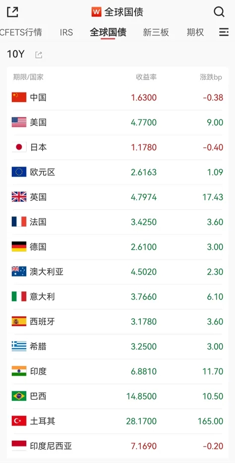 #周度策略##复盘记录##股市怎么看##收盘点评##投资干货#自美联储9$美国国债7-10年ETF-iShares(NASDAQ|IEF)$月开启降息通道以来,美债收益率却如同坐了火箭一路攀升约100个基点,这一涨势迅速在全球国债市场掀起“跟风潮”。以10年期国债为例,1月10日,英国国债收益率上行17.43bp至4.7974%;法国、德国、意大利、西班牙等国国债收益率...
