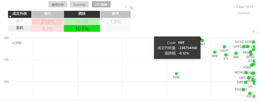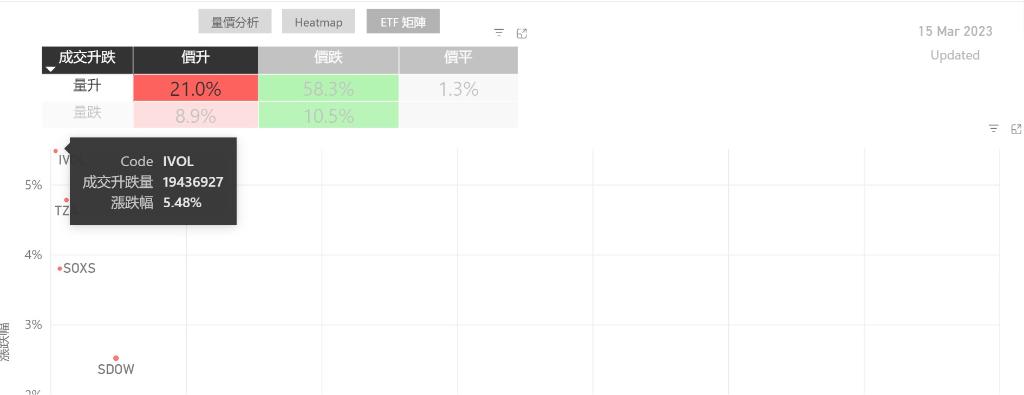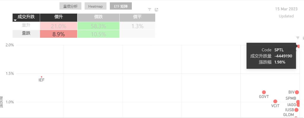 在3月15日的美股主要300只ETF交易品种中,录得有30%的ETF交易品种的ETF价格上升;尽管录得不过半数的ETF价格录得上升,不过仍有9%的ETF产品,虽然价格上升,成交额却下跌。在价升量跌的ETF当中,其中SPTL升幅最大,录得1.98%升幅;其次为$7-10年ETF-iShares(NASDAQ|IEF)$,录得1.44%。GOVT录得1.17%的升幅,属於价升量跌的ETF当中,排名第三...