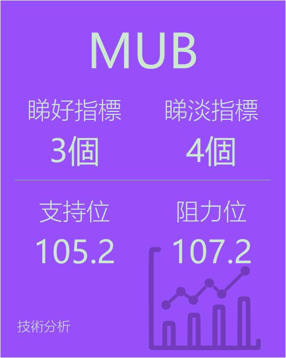 美股个股指标分析-$iSharesS&PNationalAMT-FreeMu(MUB)$看好指标2个,看淡指标4个。支持位107.1,阻力位108.6,仅供参考。相关证券:美国市政债ETF-iShares(MUB)