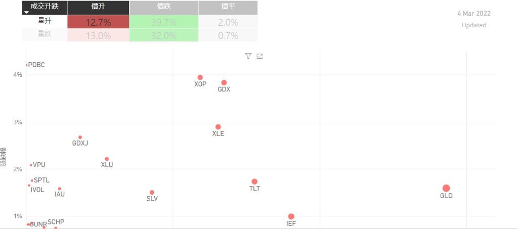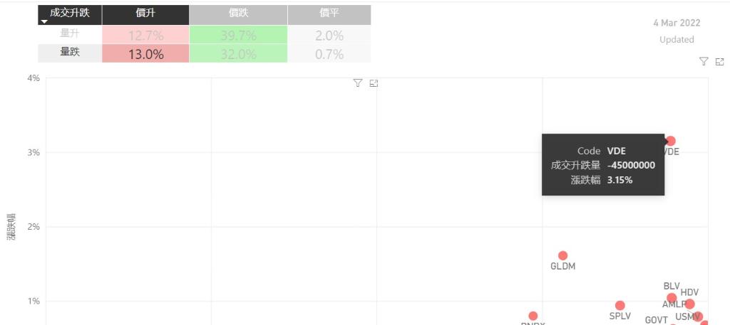 在3月4日的美股主要300只ETF交易品种中,有26%的ETF交易品种的ETF价格上升;尽管只有少数ETF价格录得上升,不过仍有13%的ETF产品,虽然价格上升,成交额却下跌。在价升量跌的ETF当中,VDE升幅最大,录得3.15%升幅;其次为GLDM,GLDM录得1.61%。BLV录得1.04%的升幅,属於价升量跌的ETF当中,排名第三。如果考虑部署短期追升ETF,可以考虑以下品种,比如PDBC...
