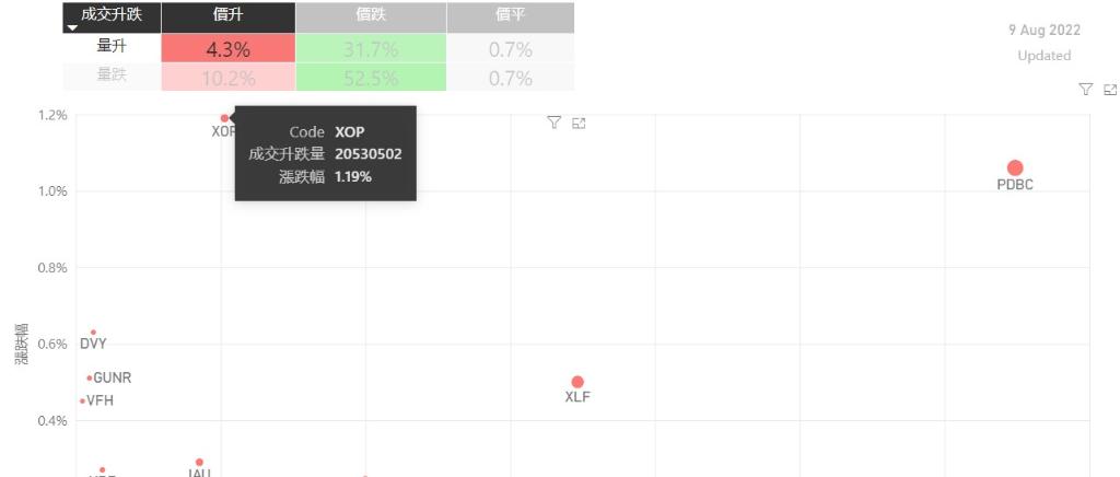 在8月9日的美股主要300只ETF交易品种中,录得有15%的ETF交易品种的ETF价格上升;尽管录得过半数的ETF价格录得上升,不过仍有10%的ETF产品,虽然价格上升,成交额却下跌。在价升量跌的ETF当中,VDE升幅最大,录得1.87%升幅;其次为XLE,录得1.76%。FAS录得1.34%的升幅,属於价升量跌的ETF当中,排名第三。如果考虑部署短期追升ETF,可以考虑以下品种,比如XOP...