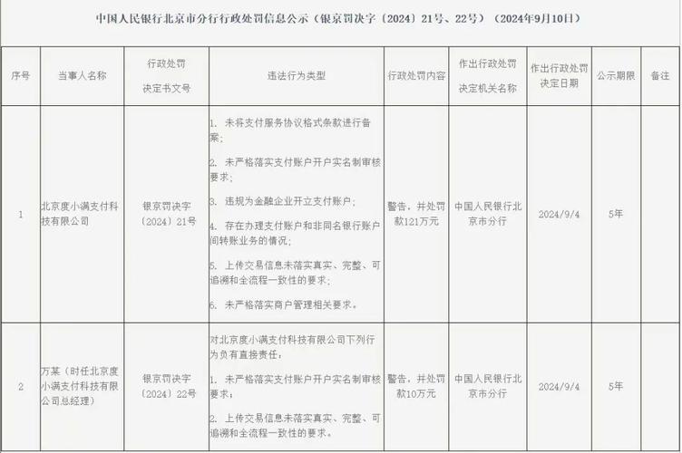 这不仅暴露了度小满在合规管理上的漏洞,也为其冲击资本市场的道路增添不少挑战。@新熵原创作者丨依曼编辑丨蕨影度小满支付业务被重罚,且该处罚信息将被公示长达五年。9月10日,央行北京市分行发布行政处罚,公示表显示,北京度小满支付科技有限公司因六项违法违规行为,被警告并罚款121万元。除此之外,当时担任度小满支付总经理的万某也被警告并罚款10万元。度小满,原百度金融,2018...