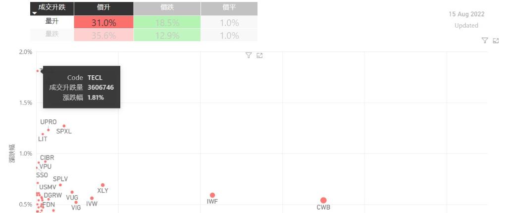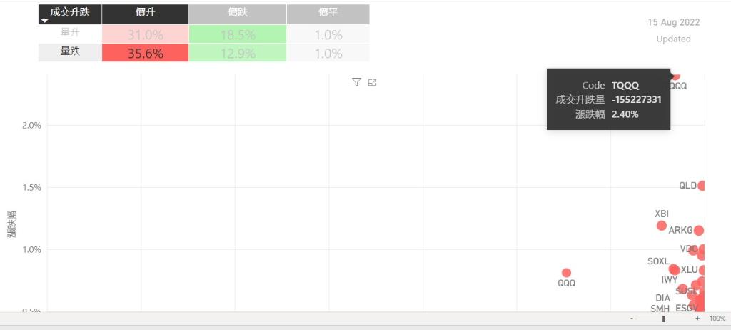 在8月15日的美股主要300只ETF交易品种中,录得有67%的ETF交易品种的ETF价格上升;尽管录得过半数的ETF价格录得上升,不过仍有36%的ETF产品,虽然价格上升,成交额却下跌。在价升量跌的ETF当中,TQQQ升幅最大,录得2.40%升幅;其次为QLD,录得1.51%。XBI录得1.19%的升幅,属於价升量跌的ETF当中,排名第三。如果考虑部署短期追升ETF,可以考虑以下品种,比如T...