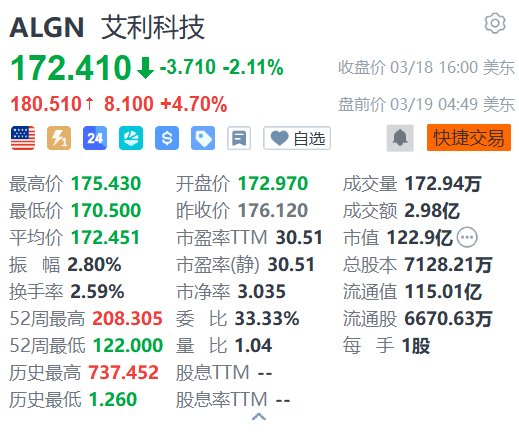 艾利科技(ALGN.US)盘前涨4.7%,报180.51美元。消息面上,有媒体援引知情人士称,激进投资者ElliottInvestmentManagement已在隐适美牙齿矫正产品制造商AlignTechnology中持有大量股份。Elliott目前是Align最大的投资者之一。消息称,Elliott计划与Align接触,鼓励其采取措施提振股价。由于牙科产品需求低迷,Align的股价自2021年达...