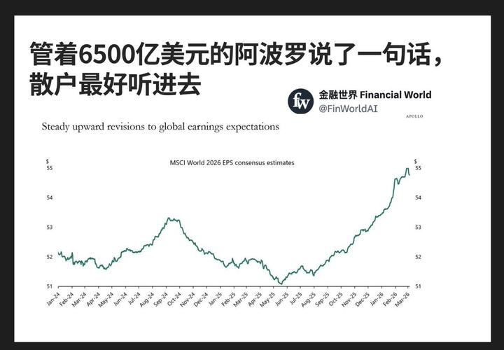 阿波罗全球管理,全球最大的另类资产管理公司之一,管理规模超过6500亿美元,客户是主权财富基金、顶级养老金、机构大户。换句话说,这家公司的判断代表的是全球最聪明的一批钱在想什么。他们的首席经济学家Slok刚刚发了一张图,MSCI全球指数2026年每股盈利共识预期,现在站上55美元历史新高,从去年下半年开始几乎垂直拉升,Slok只说了一句话:企业盈利预期没有任何放缓的迹象。 2026年3月中东战火未...