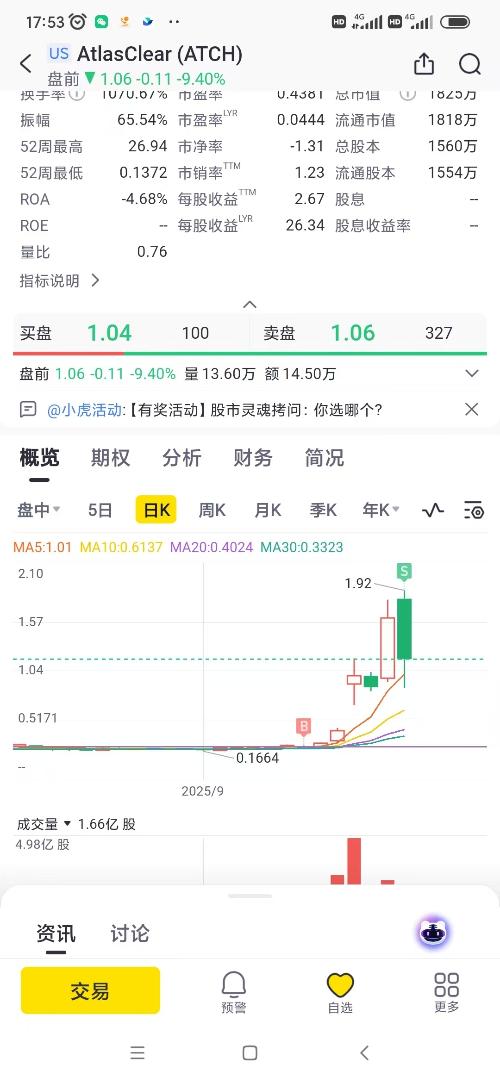 $AtlasClearHoldingsInc(AMEX|ATCH)$亏损20%了