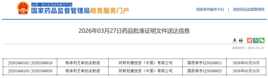 3月27日,国家药监局(NMPA)官网显示,阿斯利康和安进联合递交的TSLP单抗特泽利尤单抗注射液(tezepelumab)获批上市,用于治疗哮喘及慢性鼻窦炎伴鼻息肉病,成为中国首个获批上市的TSLP靶点单克隆抗体药物。 特泽利尤单抗由$阿斯利康(NYSE|AZN)$与$安进(NASDAQ|AMGN)$合作开发,是全球首款且目前唯一获批上市的TSLP(胸腺基质淋巴细胞生成素)单抗。作为一种同类首创...