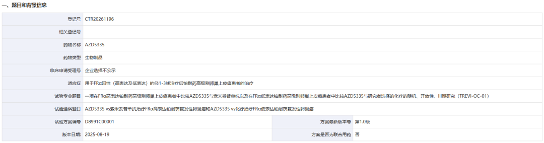 阿斯利康(AZN.US)自研ADC新药在国内启动首个III期临床。4月3日,药物临床试验登记与信息公示平台官网显示,阿斯利康(AZN.US)登记了一项AZD5335用于叶酸受体(FR)阳性(高表达及低表达)的经1-3线治疗后铂耐药高级别巢上皮癌患者治疗的III期临床(登记号:CTR20261196)。 来源:药物临床试验登记与信息公示平台官网 本次启动的是TREVI-OC-01研究的国内临床部分...