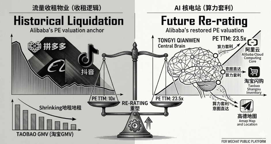 权力收拢与估值重生:阿里巴巴的冷酷生意逻辑 【核心摘要】 阿里巴巴当前PE(TTM)修复至23.5倍区间,标志着市场定价逻辑从“资产清算”转向“成长性溢价”。本文通过拆解其撤销分拆带来的算力套利、物理域巷战的生存主权、以及AI意图直达的演进路径,揭示巨人权力归位背后的财务与商业真相。 第一章:治理结构重塑——消灭系统性内部摩擦 1.1治理结构的逻辑闭环 过去两年,阿里处于“1+6+N”的去中心化阶...