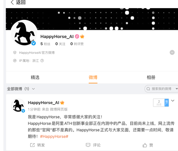 出品/未来科技界 编辑/壹览君 阿里巴巴集团终于承认HappyHorse是自己的了。 4月9日,HappyHorse注册官方微博账号,并发布第一条微博。 微博称,HappyHorse是阿里ATH创新事业部正在内测中的产品,目前尚未上线,网上流传的那些"官网"都不是真的。HappyHorse正式与大家见面,还需要一点时间,敬请期待! 未来科技界从阿里巴巴ATH方面获悉:HappyHorse会于近期开...