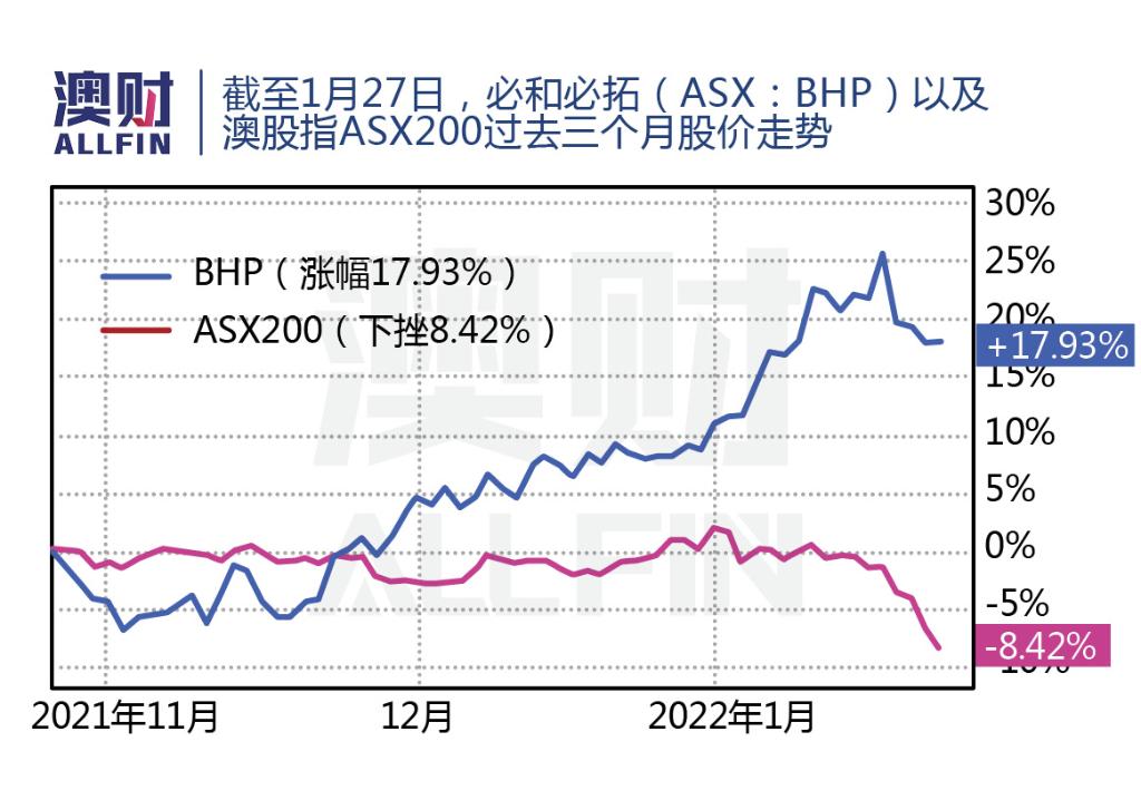 近期,由于美联储加息迫近,全球股市动荡不安,澳股ASX200指数三个月内跌去8.42%,可谓一片“哀嚎”。但有一家权重股公司的股价却逆势领跑,此前在截至1月21日的一周内,公司股价涨幅甚至超过10%,在一众大蓝筹股中成为一道靓丽的风景线。即便今天(1月27日)在美联储暗示可能3月开始加息,并为缩表做准备之后,ASX200指数午盘一度下跌超过2.8%,直接抹去近200点。尽管下午收复部分“失地”...