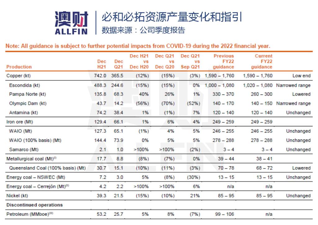 1月20日,必和必拓发布的2022上半财年运营公报(2021年7月1日—12月31日)显示,其去年下半年的铜产量为74.2万吨,同比下降12%;铁矿石产量1.29亿吨,同比增长1%;炼焦煤产量1770万吨,同比下降8%;动力煤产量720万吨,同比下降5%;镍产量3.93万吨,同比增长15%。其中,去年四季度的铜产量为36.55万吨,环比上季度增长3%;铁矿石产量为6610万吨,环比...