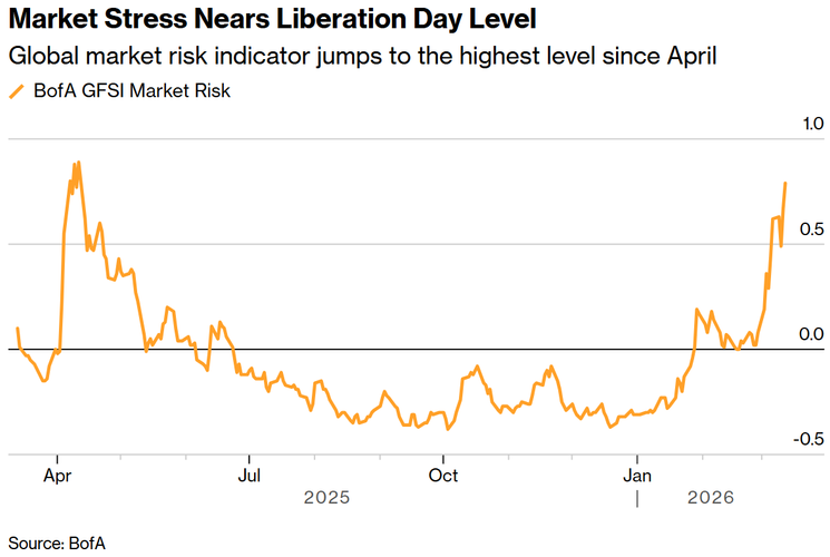 由于伊朗战争,市场压力正以自去年关税冲击以来最快的速度累积,这推高了油价并推高了借贷成本。注意到,市场压力正以自去年关税冲击以来最快的速度积聚。随着伊朗战争推高油价、拉升借贷成本并强化美元,这一组合正同时对金融市场的几乎每一个角落施加压力。 美银的一项指数显示,由全球股票、利率、货币和商品期权市场所隐含的未来价格波动率已跃升至0.79,逼近去年4月“解放日”动荡期间达到的0.89峰值...