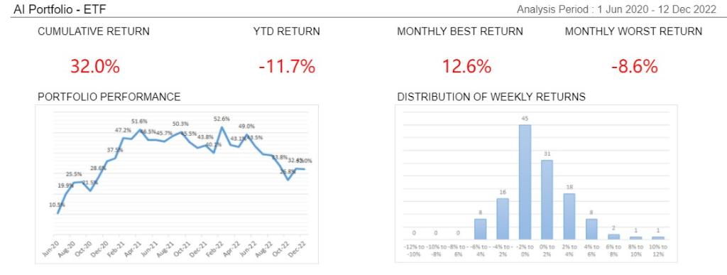 “ETF组合”基於大数据分析,每个星期选出4-5只ETF产品,以一个星期作为交易週期,设定星期一买入星期五卖出,并观察每週ETF产品的收益变化。每只ETF设定止损点为7%。从2020年6月1日至2022年12月12日整体累计收益:32%2021年初至今的年度收益:-11.7%月度最佳收益:12.6%备註:以上资料来源於「ETF组合」腾讯文档以下是2022年12月5日的「ETF组合」产品及收益:...