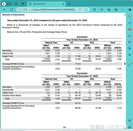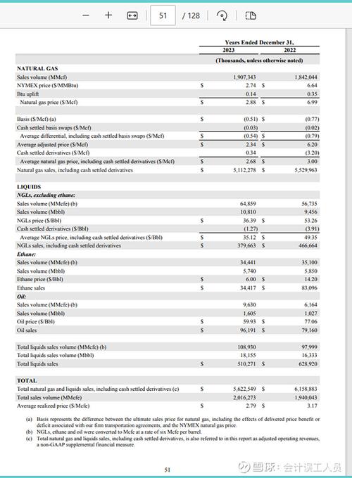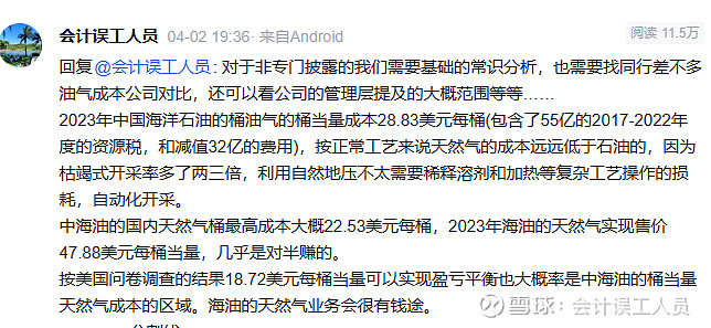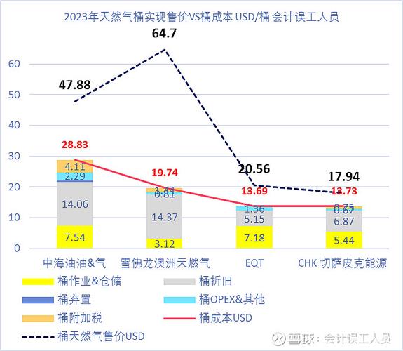 天然气的盈利能力如何?这个主要取决于不同地区的天然气实现售价和桶成本,差异可以是10万8千里的巨大不同。LNG和长距离的管道仓储运输决定了刚性的净进口国的天然气的高成本。前个星期受到@CyberShaman的提点的EQT和CHK切萨皮克能源的天然气业务,于是我也下钻进去看看,这两家公司的2023年的天然气产量占比它的总油气产量刚好都是95%,他们的单位成本都是13.7美元/桶当量。看上图2...