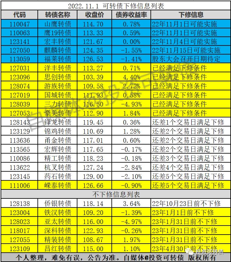 山鹰转债、鹰19转债下修到底,合理价格约为120元,利好转债。铁汉转债、亚太转债分别宣布2个月、3个月内不下修,2只转债到期均不足14个月,难道它们宁愿还钱?深科转债、精装转债、昌红转债分别宣布3个月、3个月、6个月内不下修。嵘泰转债还差5个交易日满足下修条件。可转债下修信息列表见下,供投资者参考。注:表中列出所有可能下修转债,新增不下修消息转债,近期不下修转债,不包含远期不下修转债。标黄部分为新...