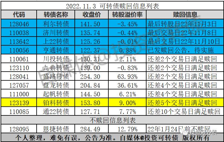 新增铂科转债还差5个交易日赎回。当前有赎回相关信息的可转债列表见下。对于已经实施赎回的可转债,投资者应注意在最后交易日之前卖出或赎回登记日之前转股,避免被低价赎回导致亏损。注:表中列出所有已经宣布赎回转债,新增不赎回消息转债,近期不赎回转债,不包含远期不赎回转债。标黄部分为新赎回消息转债。赎回影响参见《什么是可转债最大的风险?》。《高端棉纺7亿盛泰转债申购早知道》《股市回暖,多只肉签密集上市》《4...