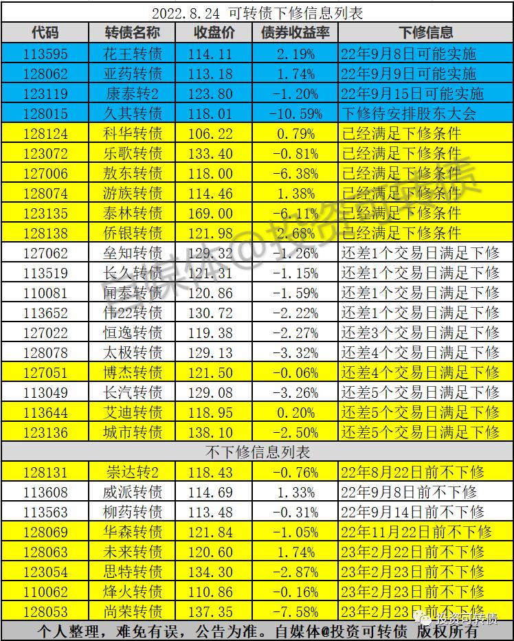 8月23日侨银转债满足下修条件,公司做出下修决定。同日满足下修条件的华森转债、未来转债、尚荣转债分别宣布3个月、6个月内不下修。至今有6只转债满足条件,等待公司做出下修决定,见表中久其转债下面标黄的6只转债。24日收盘,即将有垒知转债、长久转债、闻泰转债、伟22转债等4只转债满足下修条件,等待公司做出下修决定。新增博杰转债、艾迪转债、城市转债可能下修,分别还差4~5个交易日满足下修条件。新增烽火转...