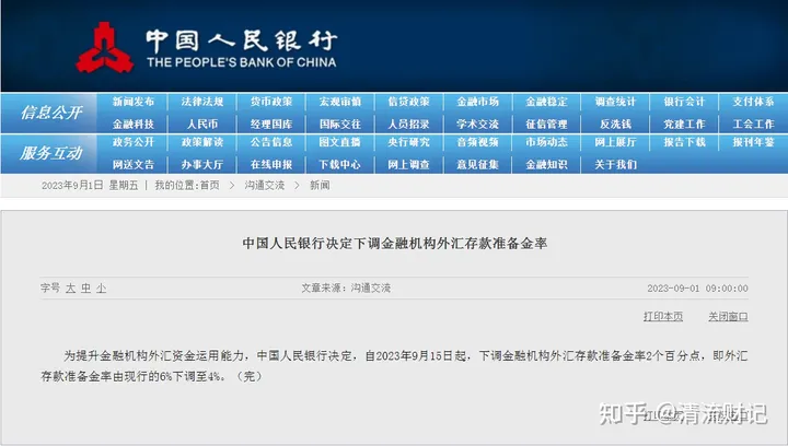 9月1日消息,为提升金融机构外汇资金运用能力,中国人民银行决定,自2023年9月15日起,下调金融机构外汇存款准备金率2个百分点,即外汇存款准备金率由现行的6%下调至4%。本轮是今年的第一次下调,上一次是在2022年5月和12月,央行为了抑制人民币汇率单边过快升值分两次上调了外汇存款准备金率,今年降低外汇准备金率,也就是将放宽中国银行体系内的美元流动性,相当于加快外汇贷款增长,从而缓和人民币汇率账...
