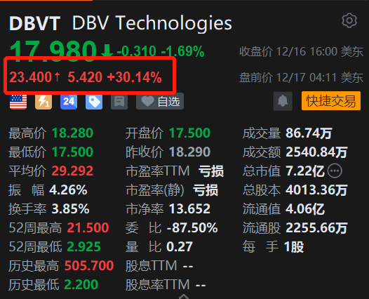 美股异动 | DBV Technologies盘前大涨超30% 4-7岁花生过敏贴片三期试验取得积极结果
