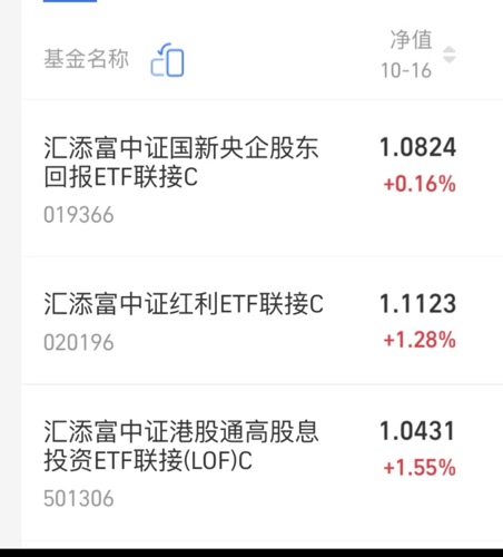 哈哈,宝子们,今天有惊喜,红利低波高股息是大晴天,快来看看吧$汇添富中证国新央企股东回报ETF联$今天收涨0.16%,目前具有强现金流、高分红、低估值特点的港股通央企红利也不失为一种好的选择$汇添富中证红利ETF发起式联接C$今天涨幅超1.28%,现在利率一降再降,市场找到稳定赚钱的确定也不容易,那么完全可以选择这只基金替代一些高门槛理财,确实也很不错。$汇添富中证港股通高股息投资ETF联...