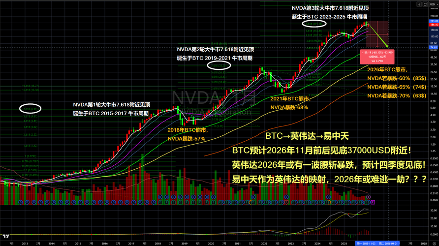 BTC→英伟达→易中天 BTC预计2026年11月前后见底37000USD附近! 英伟达2026年或有一波腰斩暴跌,预计四季度见底! 易中天作为英伟达的映射,2026年或难逃一劫???