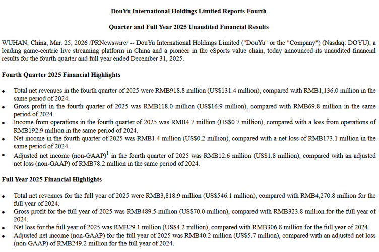 作者|赵栀 编辑|趣解商业资讯组 近日,斗鱼发布了2025年第四季度及全年未经审计的财务报告。财报显示,公司2025年全年总收入为38.19亿元,较上年同期的42.71亿元下降10.58%;全年调整后净利润达4016万元,而2024年全年调整后净亏损为2.492亿元,成功扭亏为盈。 2025年第四季度,斗鱼总收入为9.19亿元,较上年同期下降19.1%;经调整后净利为1262万元,实现季度盈利。 ...