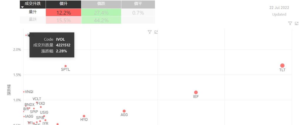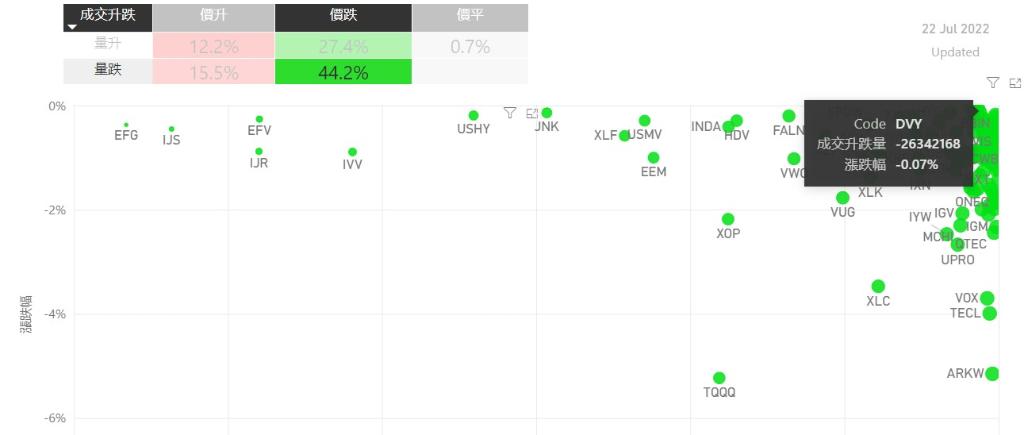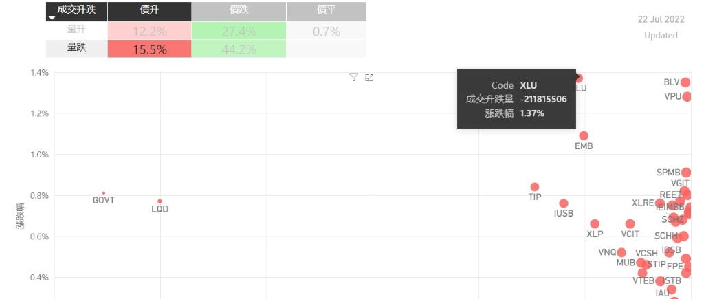 全部 热门 最新评论 最新发帖 全部 全部 个人号 机构号 ETF股票 发表于 2022-07-25 14:51 436次浏览 美股ETF市场分析(数据更新至7月22日) 在7月22日的美股主要300只ETF交易品种中,录得有27%的ETF交易品种的ETF价格上升;尽管录得过半数的ETF价格录得上升,不过仍有15%的ETF产品,虽然价格上升,成交额却下跌。在价升量跌的ETF当中,XLU升幅最大,录得1.37%升幅;其次为BLV,录得1.35%。VPU录得1.28%的升幅,属於价升量跌的ETF当中,排名第三。如果考虑部署短期追升ETF,可以考虑以下品种,比如IVO... 分享 评论 赞 发帖 APP内打开