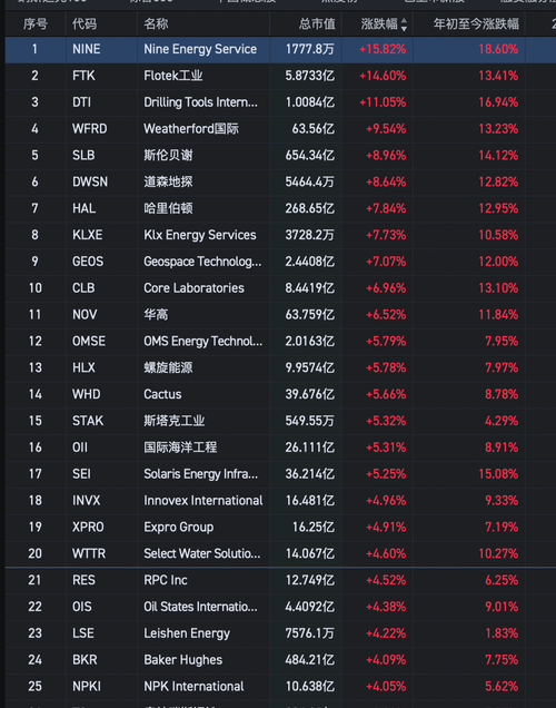 周一晚上美股市场表现最强的板块不是科技,也不是Ai,而且石油股,而且主要上涨的是石油设备板块,作为晚上美股石油设备股有3个涨幅10%以上,有9个涨幅超过7%,有17个涨幅超过5%。而这一波上涨主要有一个利好驱动的: 首先我们复盘下美股石油设备股的表现: NINE,暴涨15.82% Flotek工业,暴涨14.60% DrillingToolsIntern...,暴涨11.05% Weatherfo...