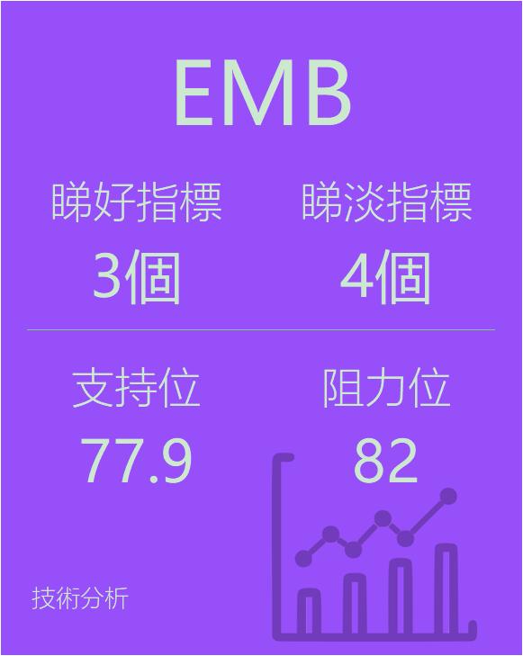 美股个股指标分析-$iSharesJPMorganUSDEmergingMarketsBondETF(EMB)$看好指标3个,看淡指标4个。支持位77.9,阻力82,仅供参考。相关证券:新兴市场美元债ETF-iShares(EMB)