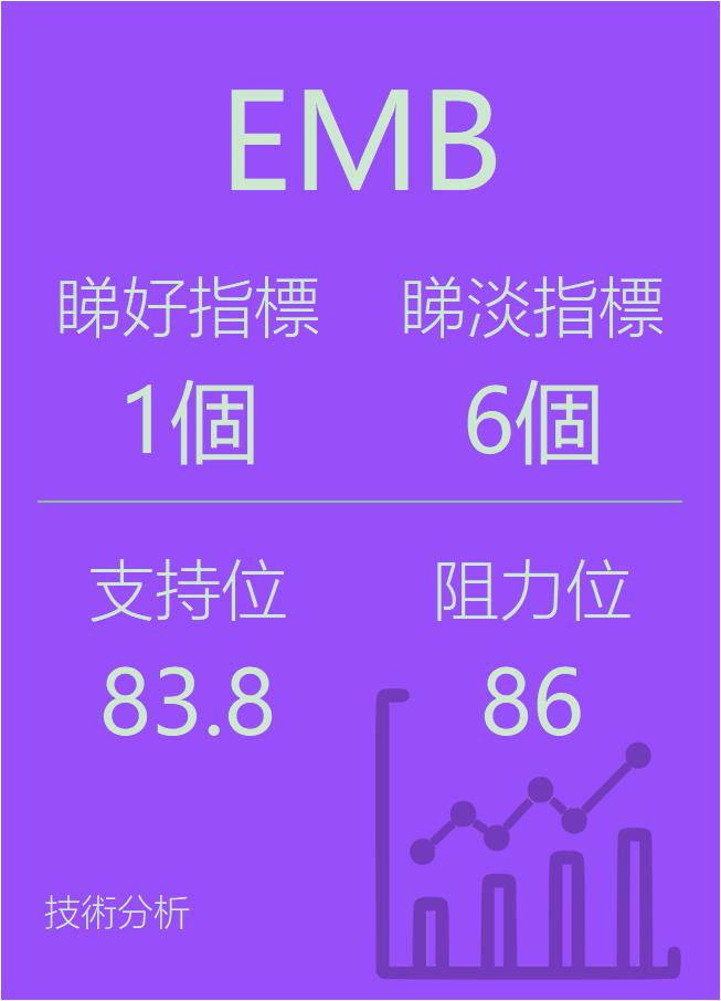 美股ETF指标分析-$新兴市场美元债ETF-iShares(NASDAQ|EMB)$看好指标1个,看淡指标6个。支持83.8,阻力86,仅供参考。