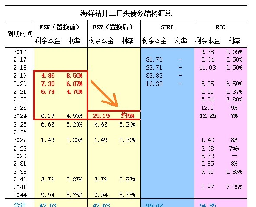 海洋钻井三巨头债务结构汇总: 1、今天ESV发布了发债公告,一口气发行了3个债券,合计19亿美金,到期日都是2024年,分别为8%利率的5亿美金,3%利率的7.5亿美金和一款6.5亿美金的(利率没有给),综合利率我估计大约略高于5%,这一点要优于RIG刚发行的两款债券利...