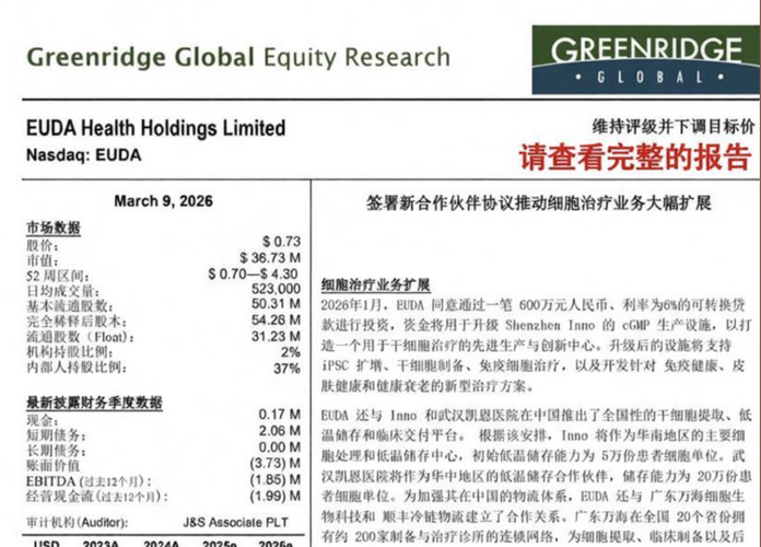 $EUDAHealthHoldingsLtd(NASDAQ|EUDA)$GreenridgeGlobal3月9日发布了关于EUDA的最新研究报告,重点包括: •细胞治疗业务扩展 •融资协议 •EUDAHelix2.0即将推出 •马来西亚与印度市场扩展 •代币整合 •模型更新 •维持评级并下调目标价 完整的英文或中文研究报告可通过我们Profile中的链接免费下载。网页链接 也可以直接联系Mona(...