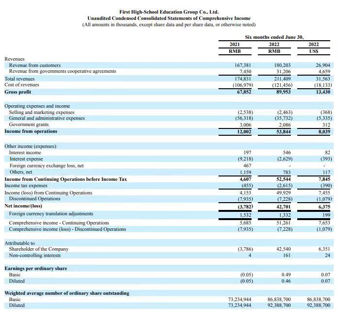 9月8日(周四)美股盘前,第一高中教育集团(FHS.US)公布了截至2022年6月30日的2022年上半年度未经审计财务业绩。根据公布的上半年财务业绩,2022年第上半年度净利润为4,270万元(637万美元),调整后净利润为4,270万元(637万美元),较2021年同期调整后净利润1,118万元,同比增长282.1%,实现同比扭亏为盈。(第一高中教育财报)公司在财报中表示,盈利能力的提升是...