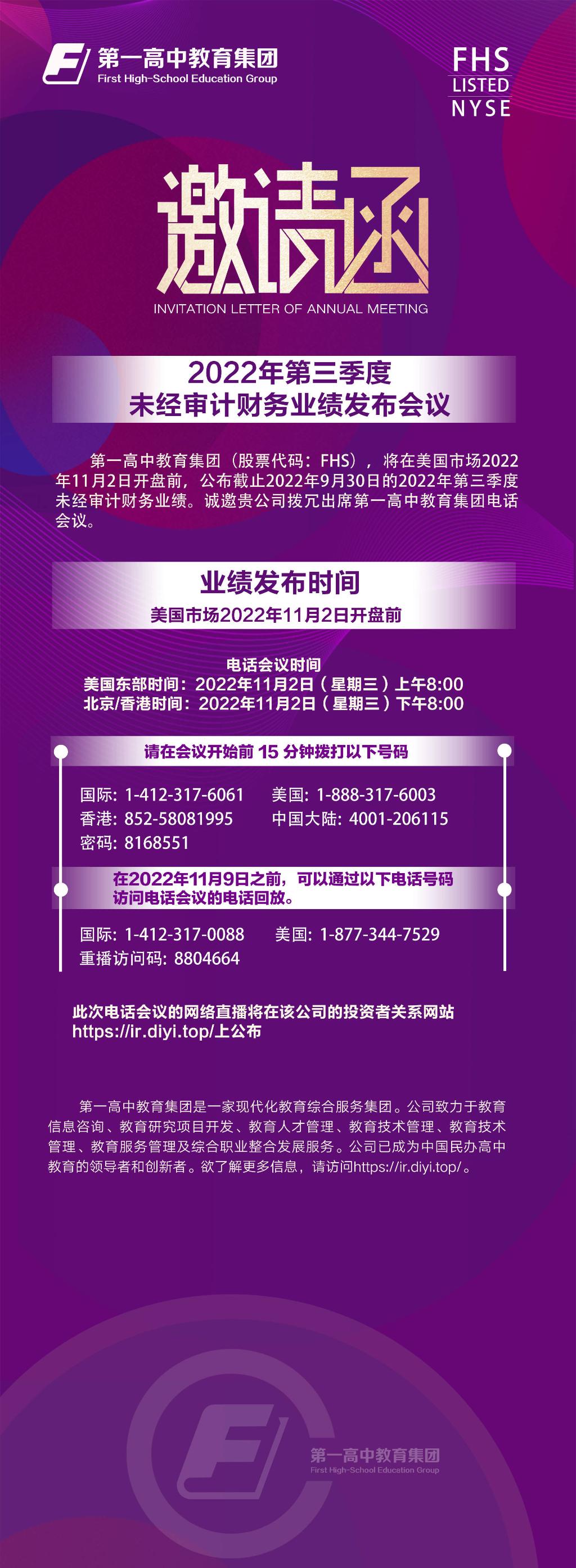 第一高中教育发布2022年第三季度未经审计财务业绩发布会议邀请函