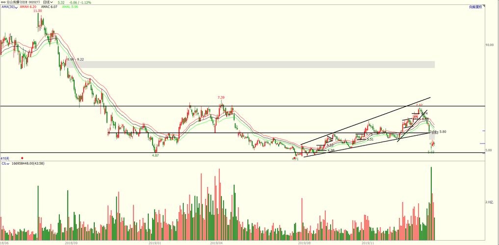 分众传媒近期创了多年的新低,15年见顶以来回调的时间空间已很充分了,低位有不断放量,周线指标底背离,周线出现倒锤头的见底信号,而且最近这波回调已出现三个以上的向下跳空缺口,做空动能已衰竭。综合来看该股底部已基本见到,短线将有一波反弹,不过该股流通盘较大,还需要反复筑底,后势比较长时间内围绕60线在一个大箱体上运行。三个月内到7元可能性很小。