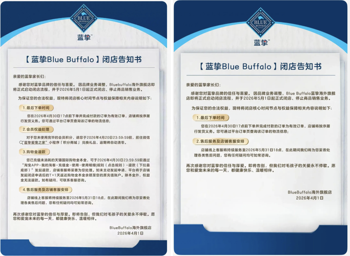 知名品牌突然宣布闭店!网友:天塌了近日,美国著名食品公司通用磨坊食品公司旗下天然宠粮品牌蓝挚,在抖音官方旗舰店、天猫海外旗舰店发布闭店告知书,宣布店铺将于2026年5月1日起正式闭店。此前,蓝挚旗下“