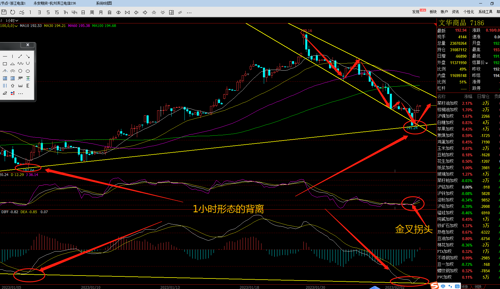 从文化商品指数1小时图形来看,是走出了一个明显的技术背离,KDJ不断的创新低,但是1小时K线却没有创新低,并且MACD现在是形成了金叉拐头向上的,这个就说明了文化商品指数短线在这个位置有明显的支撑,没有特别的利空的话短线这个位置不容易下跌突破的。从图形中还可以看出来,这周文化商品指数一直是在下降通道中下行的,但是今天打破了下降通道线的下轨之后到达了前期的上涨趋势线,然后马上开始反弹到了昨天的震荡...