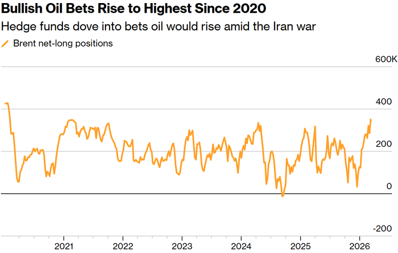 霍尔木兹海峡停摆两周,对冲基金原油多头仓位飙升至2020年来最高水平