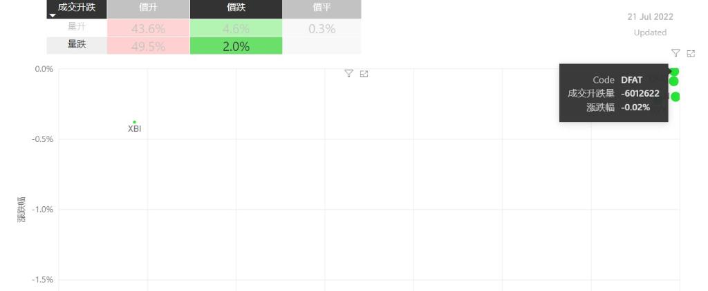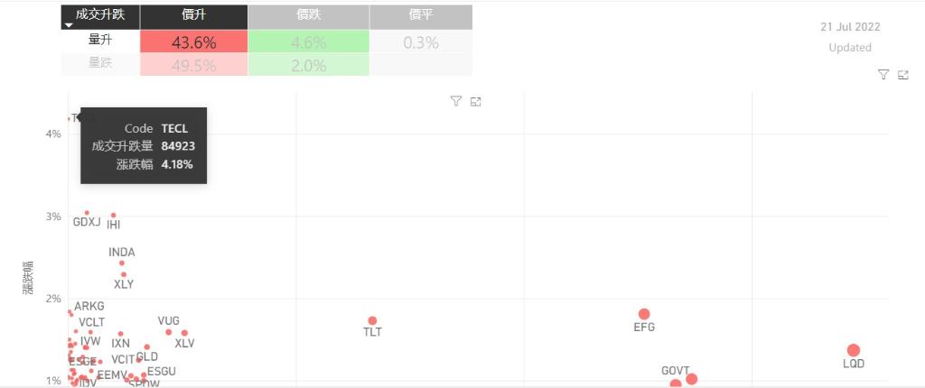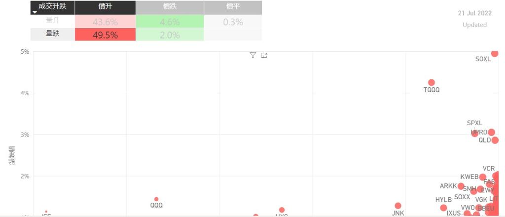在7月21日的美股主要300只ETF交易品种中,录得有93%的ETF交易品种的ETF价格上升;尽管录得过半数的ETF价格录得上升,不过仍有49%的ETF产品,虽然价格上升,成交额却下跌。在价升量跌的ETF当中,SOXL升幅最大,录得4.95%升幅;其次为TQQQ,录得4.25%。UPRO录得3.05%的升幅,属於价升量跌的ETF当中,排名第三。如果考虑部署短期追升ETF,可以考虑以下品种,比如...