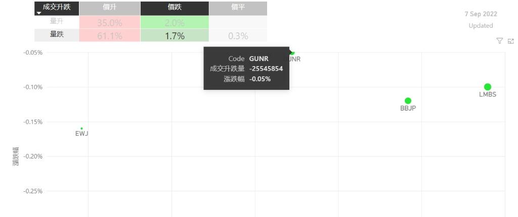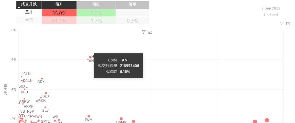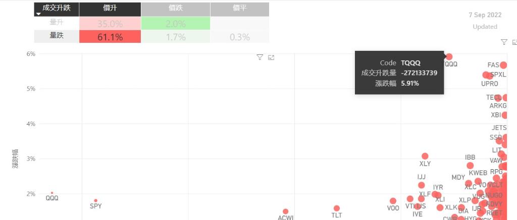 在9月7日的美股主要300只ETF交易品种中,录得有96%的ETF交易品种的ETF价格上升;尽管录得过半数的ETF价格录得上升,不过仍有61%的ETF产品,虽然价格上升,成交额却下跌。在价升量跌的ETF当中,TQQQ升幅最大,录得5.91%升幅;其次为FAS,录得5.67%。SPXL录得5.39%的升幅,属於价升量跌的ETF当中,排名第三。如果考虑部署短期追升ETF,可以考虑以下品种,比如TA...