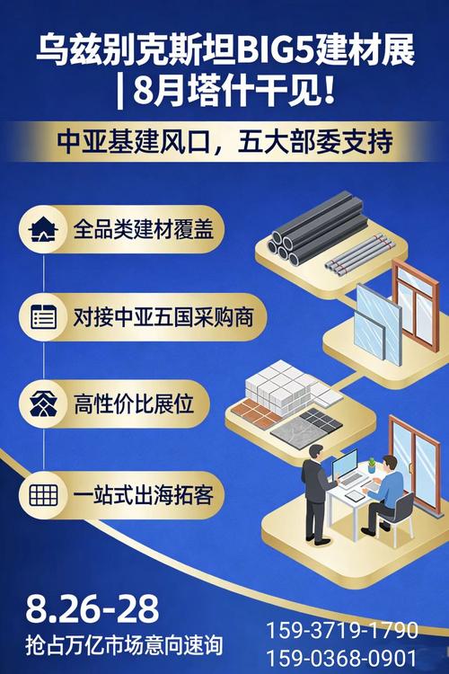 乌兹别克斯坦BIG5建材展|8月塔什干见! 中亚基建风口,五大部委支持 全品类建材覆盖,对接中亚五国采购商 高性价比展位,一站式出海拓客 8.26-28,抢占万亿市场意向速询