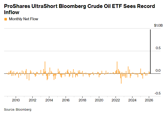 格隆汇4月1日|一批原油交易员大举做空,押注油价会从战争驱动的高位回落,但目前多数交易者都遭遇重挫。数据显示,3月ETF投资者向ProSharesUltraShortBloombergCrudeOilETF(SCO)投入9.77亿美元,创下该基金自2008年成立以来单月最大资金流入。SCO每日提供原油价格变动的两倍反向收益。尽管资金流入创纪录,SCO总资产仍仅为9.7亿美元,低于全月资金流入总额。...