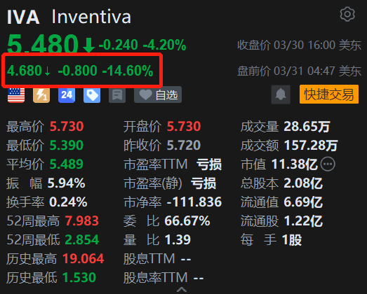 美股异动丨法国生物制药公司Inventiva盘前跌14.6% 全年净亏损扩大