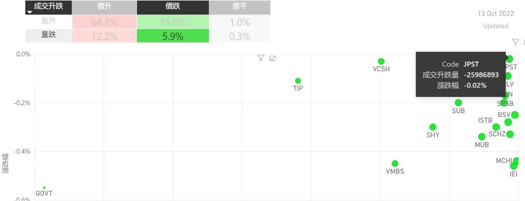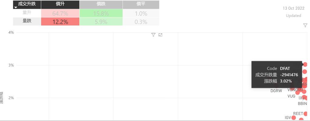 在10月13日的美股主要300只ETF交易品种中,录得有77%的ETF交易品种的ETF价格上升;尽管录得过半数的ETF价格录得上升,不过仍有12%的ETF产品,虽然价格上升,成交额却下跌。在价升量跌的ETF当中,DFAT升幅最大,录得3.02%升幅;其次为VONV,录得2.80%。IUSV录得2.59%的升幅,属於价升量跌的ETF当中,排名第三。如果考虑部署短期追升ETF,可以考虑以下品种,比...
