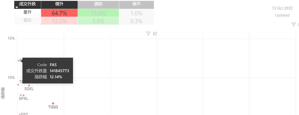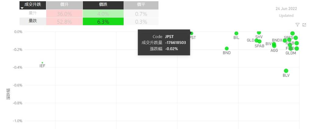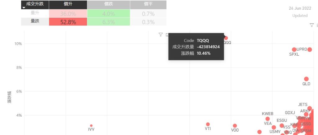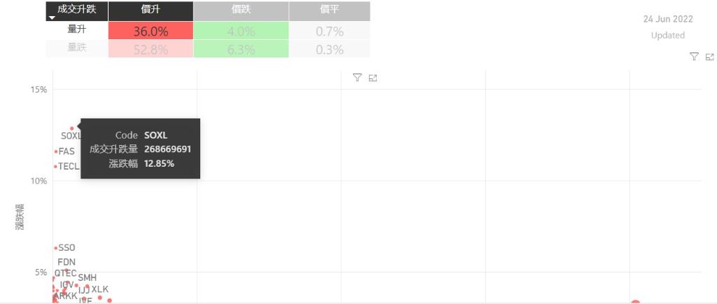 在6月24日的美股主要300只ETF交易品种中,录得有89%的ETF交易品种的ETF价格上升;尽管录得过半数的ETF价格录得上升,不过仍有53%的ETF产品,虽然价格上升,成交额却下跌。在价升量跌的ETF当中,TQQQ升幅最大,录得10.46%升幅;其次为UPRO,录得9.49%。SPXL录得9.49%的升幅,属於价升量跌的ETF当中,排名第三。如果考虑部署短期追升ETF,可以考虑以下品种,比...